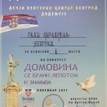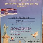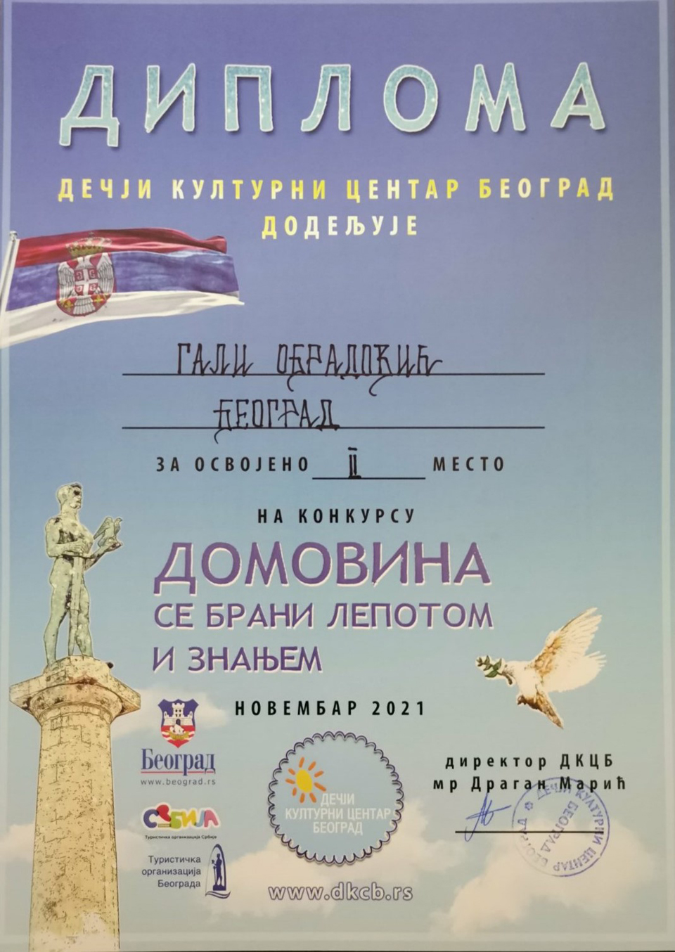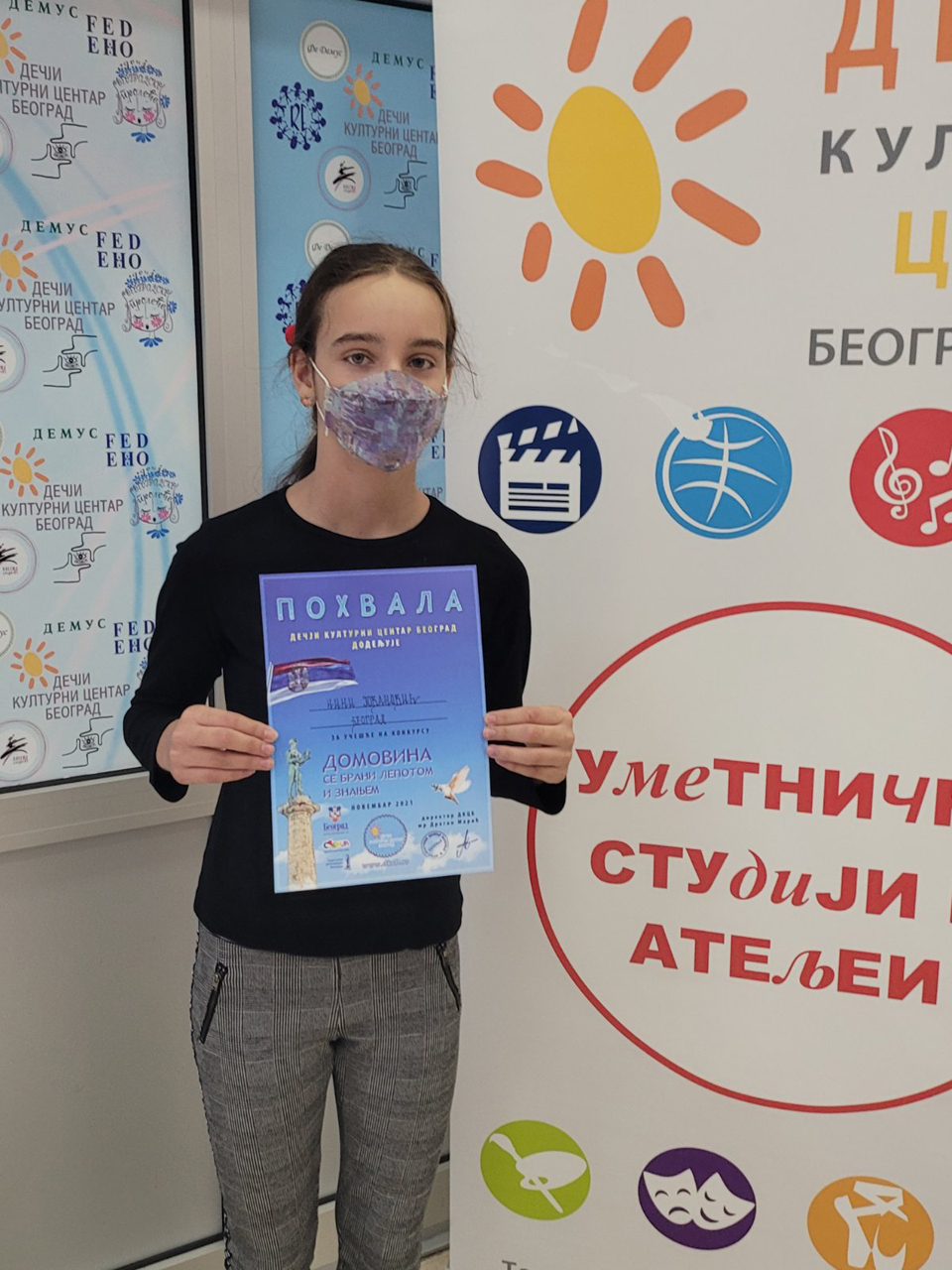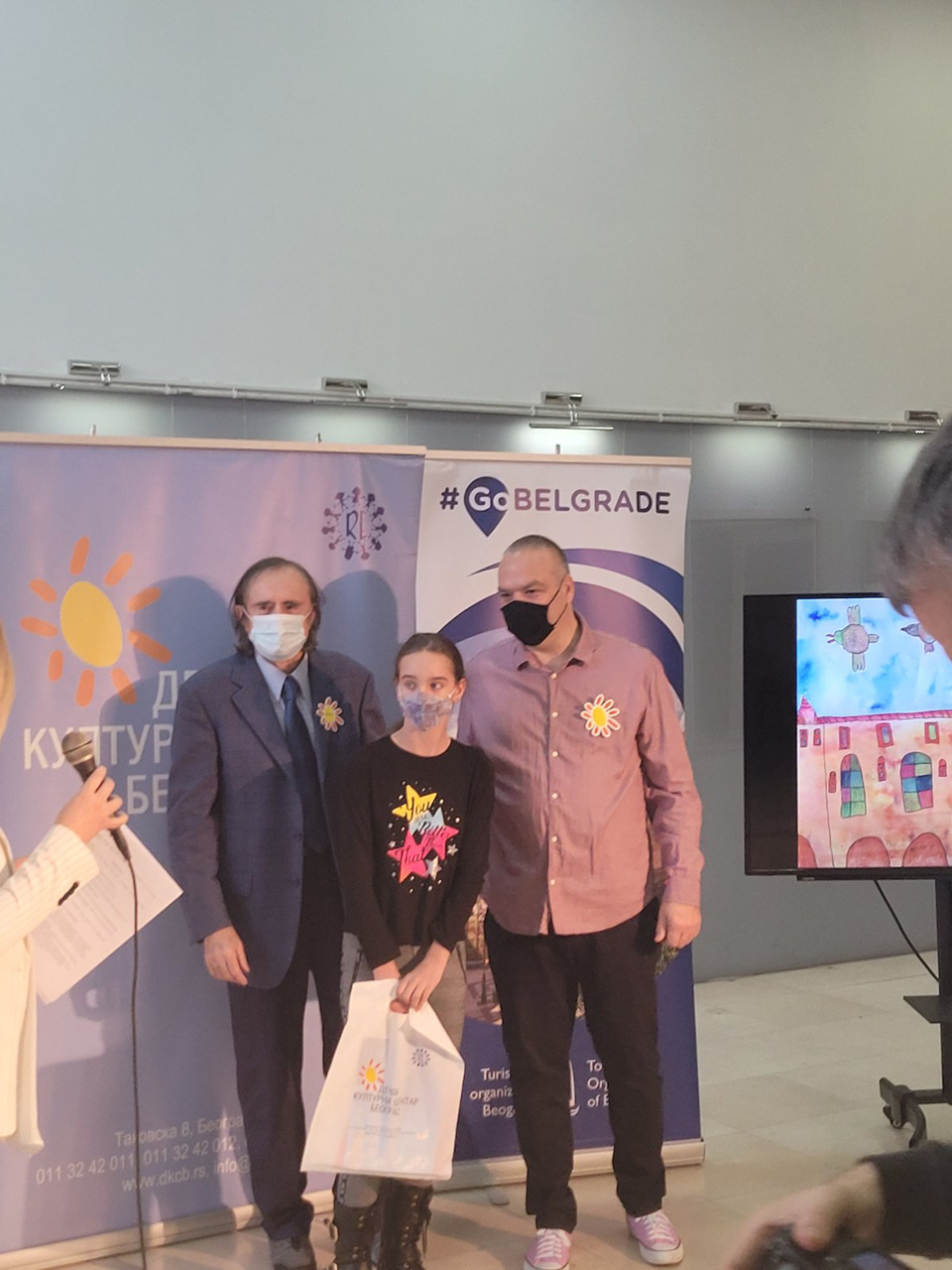На ликовни конкурс пристигло је 582 ликовна рада из целе земље и дијаспоре. У категорији деце од 7 до 9 година, Гала Обрадовић, наша ученица одељења III3, освојила је другу награду. Гала је већ награђена за свој ликовни рад на конкурсу „Дете је дете да га волите и разумете“, организованом поводом Дечје недеље, а ова награда потврђује њен несумњиво велики ликовни таленат.