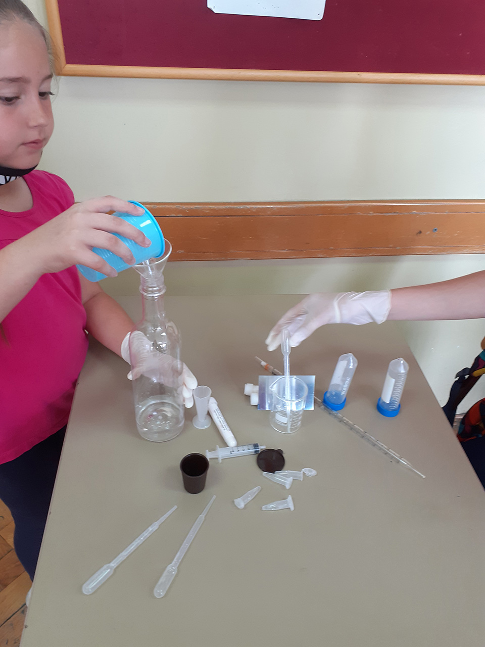 Ученици су били и у улози истраживача. Изводили су различите огледе о течностима и материјалима. На занимљив начин су усвајали знања у области математике (запремина течности). Неки од ђака су након тога одлучили да се у будућности баве природним наукама. Захваљујемо молекуларној биолошкињи Јелени Пауновић, мајци наше ученице, што нам је припремила прибор из лабораторије и омогућила извођење огледа за време часова.